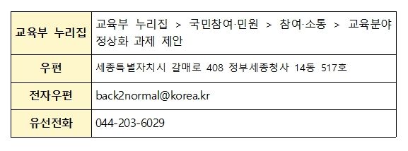 아울러, 교육부는 ‘교육 분야 정상화 과제 제안’ 창구를 지속 운영하여, 정책수요자가 생각하는 불합리한 사례들에 대해 지속적으로 관리하고, 최소 반기별로 정상화 과제를 지속 선정‧관리해 나갈 계획이다.