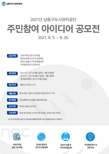 (포탈뉴스) 인천시 남동구도시관리공단은 공단 운영에 주민의 지속적 관심과 참여를 유도하기 위해 주민참여 아이디어 공모전을 개최한다고 5일 밝혔다.