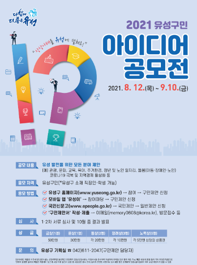 (포탈뉴스) 대전 유성구는 8월 12일부터 9월 10일까지 30일간 상상나래가 펼쳐진 창의적인 아이디어를 공모한다고 9일 밝혔다.