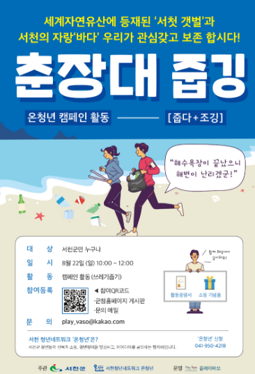 (포탈뉴스) 서천군 청년네트워크 온청년은 오는 22일 일요일 오전 10시부터 춘장대해수욕장 일원에서 줍깅 캠페인을 함께할 참가자를 모집한다.