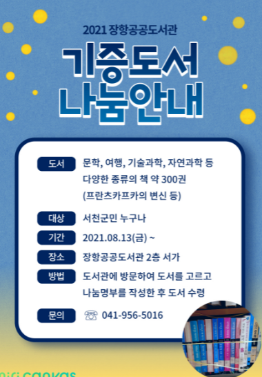 (포탈뉴스) 서천군 장항공공도서관에서는 8월 13일부터 2층 서가에서 “기증도서 무료 나눔 행사”를 진행한다.