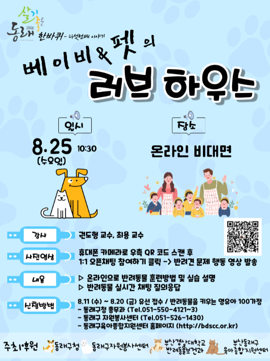 참여 인원은 반려동물을 키우는 영유아 100가정으로 8월 20일까지 전화로 동래구 자원봉사센터, 동래구 총무과로 신청하면 된다.