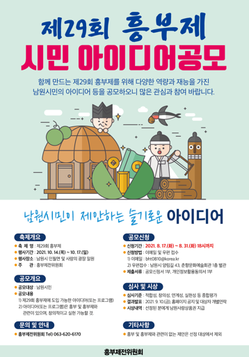 선정된 아이디어는 제29회 흥부제에 반영하여 프로그램이나 운영방안 등에 활용할 계획이며, 선정된 시민들에게는 남원사랑상품권을 지급할 예정이다.