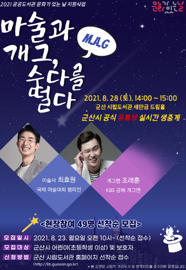 (포탈뉴스) 군산시립도서관은 오는 28일 오후 2시 새만금 드림홀에서 마술과 개그를 함께 즐길 수 있는 코미디 스토리텔링 공연 「마술과 개그, 수다를 떨다」를 운영한다고 19일 밝혔다.