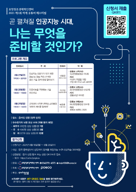 (포탈뉴스) 포항창조경제혁신센터는 인공지능 시대에 미래를 준비할 통찰력을 얻을 수 있는 ‘2021 하계 유튜버 페스티벌’을 개최한다.