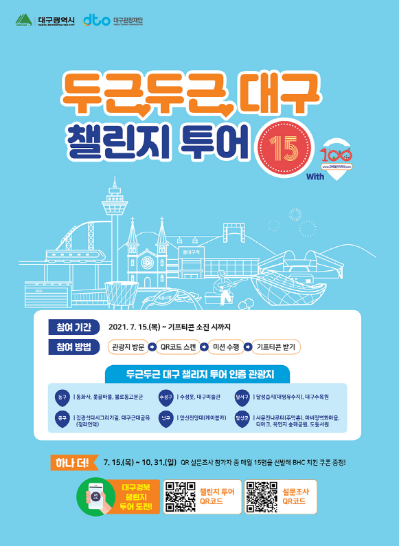 ‘대구 챌린지 투어 15’는 11월 말까지 진행될 예정이며 참가자 증가에 따른 기프티콘 소진 시 챌린지가 조기 종료될 수 있다. 상세한 내용은 챌린지투어 웹사이트와 대구관광 SNS를 통해 확인할 수 있다.