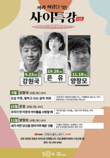 ‘사이특강’이란 명칭은 ‘책과 사람을 잇는다’는 뜻을 담고 있으며 강원국, 은유, 양창모 작가가 9월 23일과 10월 28일, 11월 18일 각각 오후 2시에 잇달아 온라인으로 강의한다.