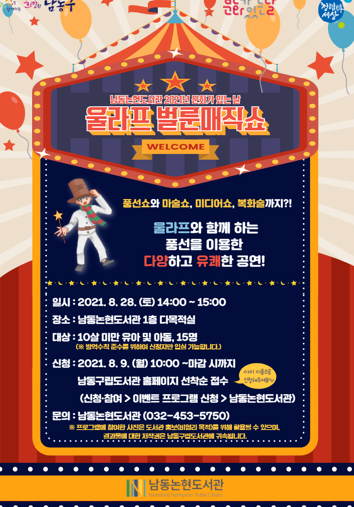 (포탈뉴스) 인천시 남동구 남동논현도서관은 오는 28일 오후 2시 문화가 있는 날 공연으로 풍선쇼와 마술을 함께 즐길 수 있는 ‘울라프 벌룬매직쇼’를 운영한다고 23일 밝혔다.