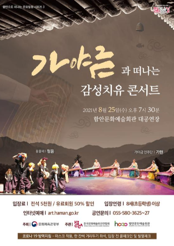 (포탈뉴스) 가야금연주단 ‘가현’과 풍물패 ‘청음’이 함께하는 ‘가야금과 떠나는 감성치유 콘서트’ 공연이 8월 25일 오후 7시 30분 함안문화예술회관 대공연장 무대에 오른다.