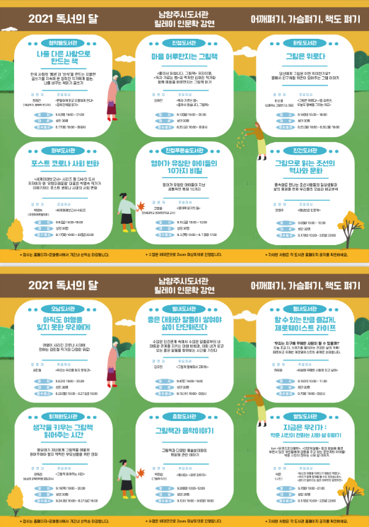 릴레이 인문학 강연은 9월 4일부터 28일까지 각 도서관 온라인 강연장에서 진행되며, 프로그램 참가자들은 책 읽기와 그림책, 음악, 코로나19 이후의 사회 변화 등 다양한 주제로 토론을 펼칠 예정이다.