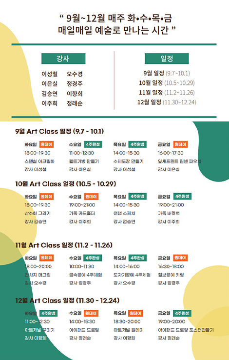 <범어아트클래스>는 9월 7일부터 12월 24일까지 16주 동안, 매주 화요일 ~ 금요일 매일 다른 예술 교육프로그램으로 시민들과 만난다. 각 수업은 원데이 클래스와 4주 완성 정규클래스로 나누어져 있어 시민들은 본인이 원하는 클래스를 선택해 신청할 수 있으며, 다양한 장르를 더 쉽게 접할 수 있다.