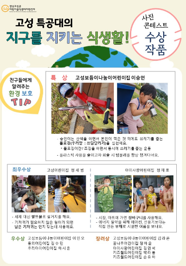 (포탈뉴스) 고성군어린이급식관리지원센터는 관내 어린이를 대상으로 환경의 중요성을 알리고자 ‘고성 특공대의 지구를 지키는 식생활’ 제4회 사진콘테스트를 개최한 결과 이승언 어린이(고성보듬이나눔이어린이집)가 특상을 수상했다고 밝혔다.