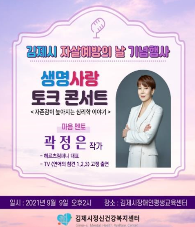김제시는 2021년‘자살예방의 날’기념일에 코로나19 장기화로 지친 시민들을 위해 생명사랑 토크 콘서트를 기획하여 현재 방영 중인 인기 TV방송‘연애의 참견’에 출연 중인 곽정은 작가를 모시고 '자존감이 높아지는 심리학 이야기'라는 주제로 강연을 하고, 학생들의 고민(학업, 인간관계 등)을 함께 나누고 공감하는 시간을 가질