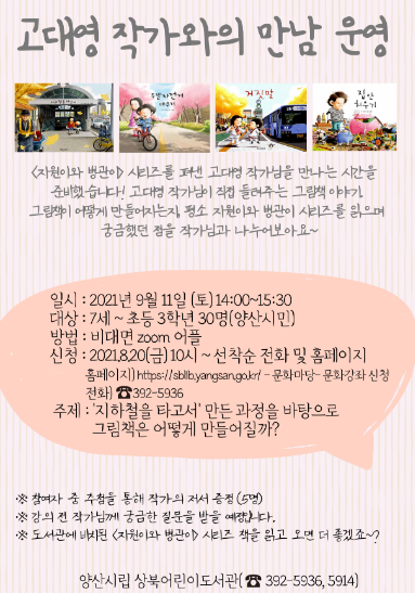 작가님의 저서인『지하철을 타고서』를 만든 과정을 바탕으로‘그림책은 어떻게 만들어질까?’라는 주제로 강연이 진행되며, 7세부터 초등 3학년 30명을 대상으로 한다. 신청은 8월20일부터 마감 시까지 도서관 홈페이지 또는 전화로 접수할 수 있다.