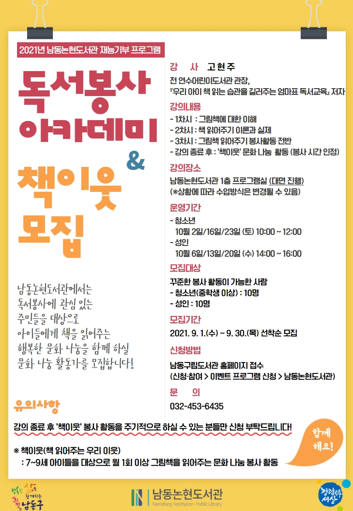 독서봉사 아카데미 프로그램은 총 3차시로 진행되며, 참여를 희망하는 주민은 9월 1~30일까지 남동구립도서관 홈페이지를 통해 온라인으로 접수 가능하다.