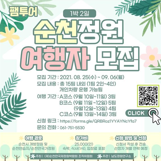 (포탈뉴스) (재)순천만국제정원박람회 조직위원회는 개방정원과 순천시 관광자원을 연계한 정원관광 콘텐츠인 ‘순천정원여행 팸투어’를 실시한다.