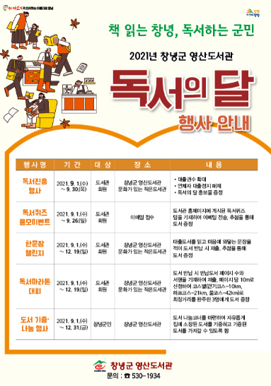 군은 코로나19 장기화로 심신(心身)이 지친 군민들이 독서로 마음을 힐링하여 코로나 블루를 극복할 수 있도록 올해 2월부터 ‘책 읽는 창녕, 독서하는 군민’ 운동을 추진해오고 있으며, 이번 독서의 계절 가을을 맞이하여 책 읽는 분위기가 다시 한번 널리 번져갈 수 있도록 추진한다는 계획이다.
