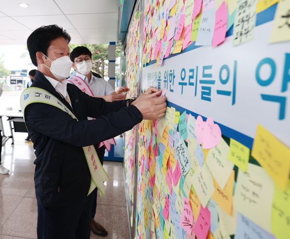 이에 직원들은 ‘청렴에 대한 나의 다짐’을 손글씨로 직접 써서 군청 현관 출입문에 부착하는 퍼포먼스를 진행하며 청렴 실천의지를 다졌다.