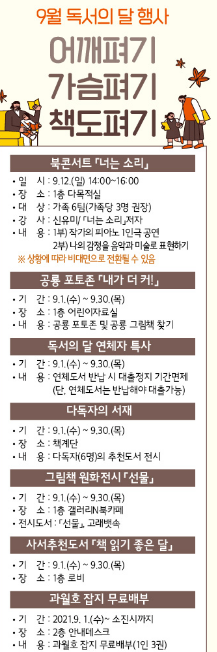 이번 독서의 달은 지치고 힘들었던 하루의 무거운 어깨와 답답한 마음을 달래 주며 위로가 되기 위해‘어깨펴기 가슴펴기 책도펴기’라는 슬로건 아래 북 콘서트, 전시, 체험 등 7개의 행사가 마련된다.
