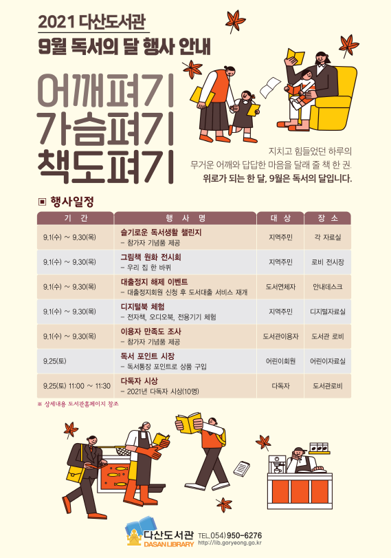 (포탈뉴스) 고령군 다산면 다산도서관은 9월 독서의 달을 맞이하여 ‘어깨펴기, 가슴펴기, 책도펴기’라는 슬로건으로 한달간 다채로운 독서문화 행사를 운영한다.