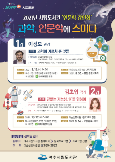 (포탈뉴스) 여수시립도서관이 ‘과학, 인문학에 스미다’라는 주제로 이정모 관장과 김초엽 작가를 초청해 ‘인문학 강연회’를 개최한다.