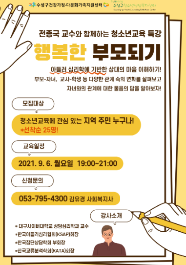 행복한 부모 되기 특강은 2021년 부모 및 부부역할지원사업의 일환으로, 지역 내 청소년자녀를 둔 학부모와 청소년교육에 관심이 있는 주민들이 대상이다.