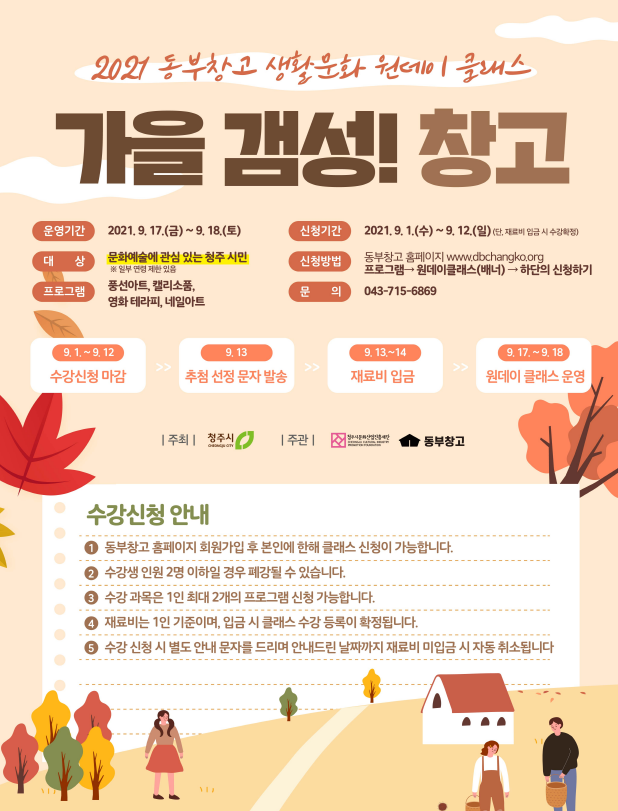 (포탈뉴스) 청주시문화산업진흥재단이 운영하는 동부창고가 오는 9월 1일부터 12일까지, 생활문화 원데이 클래스 ‘가을 갬성! 창고’수강생을 모집한다고 밝혔다.