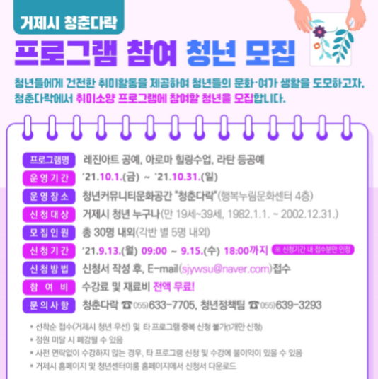 (포탈뉴스) 거제시는 청년들에게 건전한 취미활동을 제공해 청년들의 문화·여가생활을 도모하고자 청춘다락 10월 프로그램에 참여할 청년을 모집한다고 밝혔다.