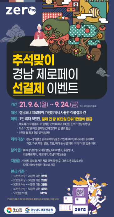 (포탈뉴스) 경상남도와 (재)경상남도경제진흥원은 코로나19로 어려움을 겪고 있는 소상공인 경영부담을 줄이고 소비 활성화를 위해 ‘추석맞이 경남 제로페이 선결제 이벤트’를 9월 6일부터 실시한다.