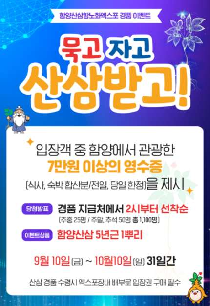‘묵고자고산삼받고 이벤트’는 함양에서 관광한 7만 원 이상의 영수증(식사, 숙박 합산분/전일, 당일 한정)을 제시하면 오후 2시부터 선착순으로 함양산삼을 경품으로 증정한다.