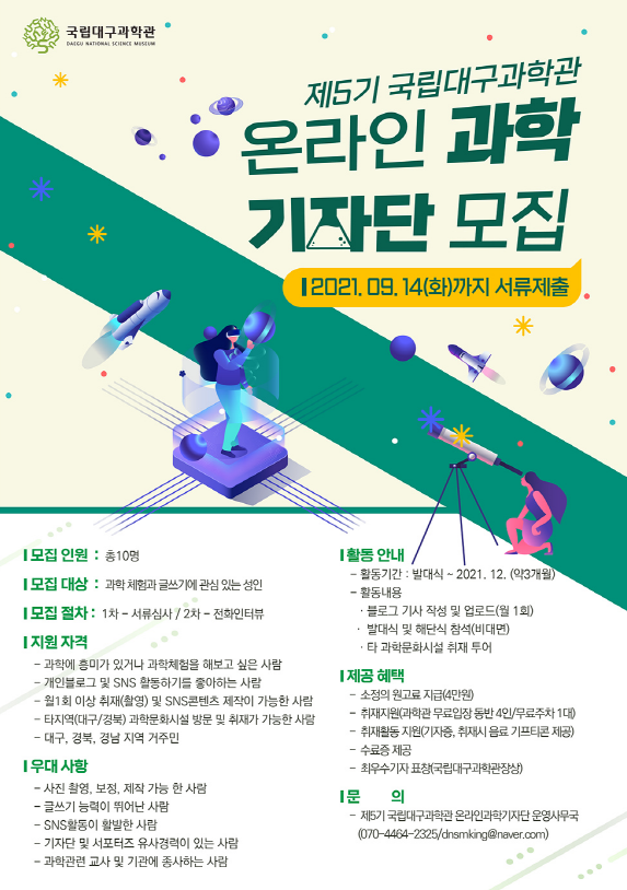 (포탈뉴스) 국립대구과학관은 과학기술의 중요성과 과학문화에 대한 대중들의 관심을 높이기 위해 오는 9월 14일까지 『제5기 국립대구과학관 온라인 과학기자단』을 모집한다.