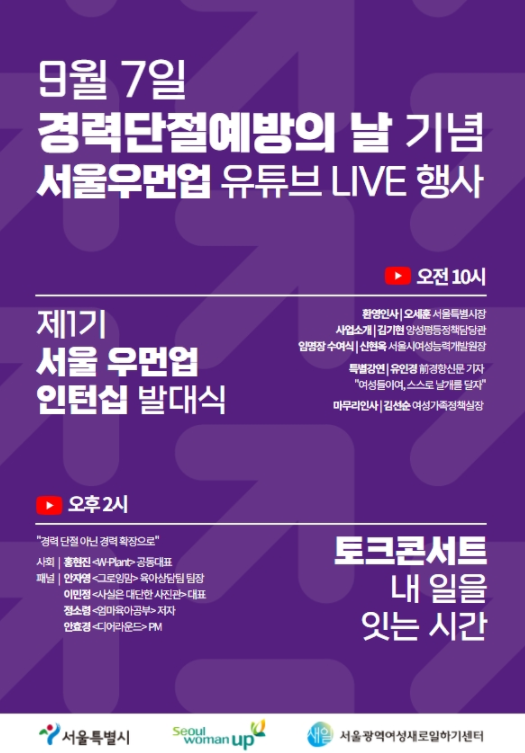시는 7일 경력단절예방의 날을 기념해 제1기 ‘서울 우먼업 인턴십’ 발대식(오전10시)을 갖는다. 경력단절 예방과 인식개선을 위한 토크콘서트(오후2시)도 진행된다. 모두 온라인 생중계(유튜브 ‘서울우먼업’ 채널)로 진행된다.