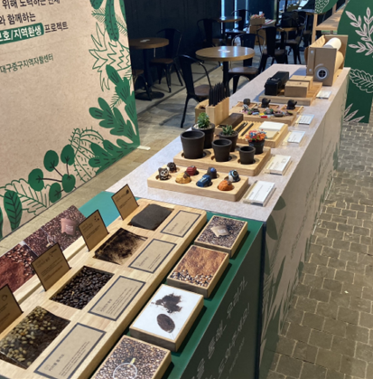 특히 이달부터는 대구신세계백화점과 협업해 신세계백화점 8층에 커피박 재활용품 체험매장 ‘커피박 환생스토어’를 운영한다. 환경보호와 지역상생을 의미하는 ‘환생스토어’에서는 시민들이 직접 커피화분에 식물도 심고 열쇠고리 꾸미기 등을 체험하면서 재미와 환경 그리고 이웃사랑도 실천할 수 있다.