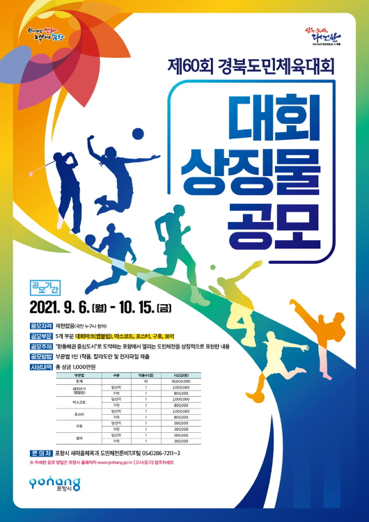 김신 새마을체육과장은 “이번 대회 상징물 공모에 전 국민(도민)의 적극적인 참여와 관심을 부탁드린다”며, “2022년 포항시에서 개최하는 제60회 경북도민체육대회의 성공적 개최를 위해 빈틈없이 준비해 나갈 것이다”라고 전했다.