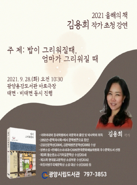 (포탈뉴스) 광양시립도서관이 오는 28일 오전 10시 30분 용강도서관에서 2021 올해의 책으로 선정된 도서 「밥이 그리워졌다」의 저자 김용희 작가를 초청해 ‘밥이 그리워질 때, 엄마가 그리워질 때’라는 주제로 강연을 연다.