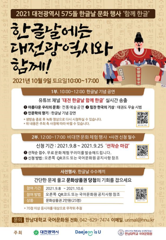 대전시가 주최하고 한남대학교 국어문화원이 주관하는 이번 한글날 기념 문화행사는 코로나19의 확산 방지를 위해 비대면으로 개최되며, 사전행사, 1부(공연 및 특강)와 2부(문화체험행사)로 진행된다.