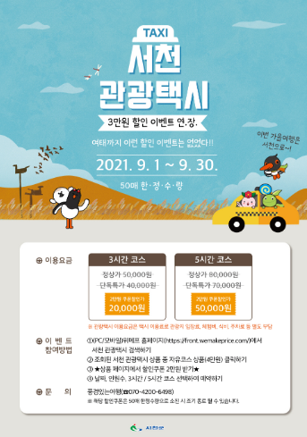 (포탈뉴스) 서천군은 지난 8월 진행했던 서천 관광택시 3만원 할인이벤트를 이번 9월 말까지 연장한다고 밝혔다.