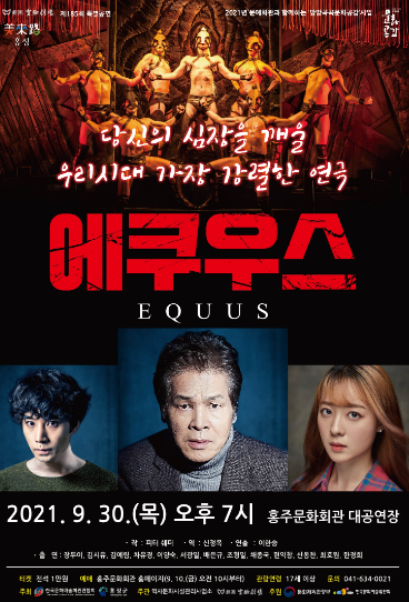 (포탈뉴스) 홍성군이 대한민국 연극사의 기념비적인 작품으로 손꼽히는 연극‘에쿠우스(EQUUS)’를 오는 9월 30일 오후 7시에 선보인다.