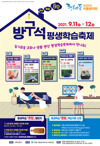 김병진 평생교육과장은 “올해는 코로나19 상황으로 인해 온라인 평생학습축제로 찾아뵙게 되었지만 내년에는 마스크 없이 축제장에서 즐길 수 있는 평생학습축제가 될 수 있기를 고대한다”라며 힘든 시기를 함께 이겨내자는 뜻을 전했다.