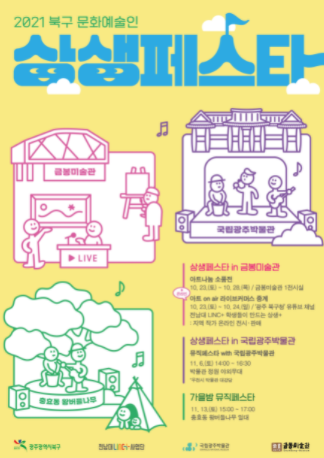 공연 분야로는 분야별 공연단체와 가수들이 참여해 11월 6일 국립광주박물관 정원 야외무대에서 ‘뮤직페스타 with 국립광주박물관’과 11월 13일 충효동 왕버들나무 일대에서 열리는 ‘가을밤 뮤직페스타’ 등이 준비돼있다.