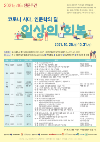 교육부와 한국연구재단이 주최하고 부산대학교와 북구청이 주관하는 이번 행사는 ‘코로나 시대-인문학의 길, 일상의 회복’이라는 주제로 위드코로나 시대 일상회복에 대한 인문학적 인식을 제고하기 위해 추진되었다.