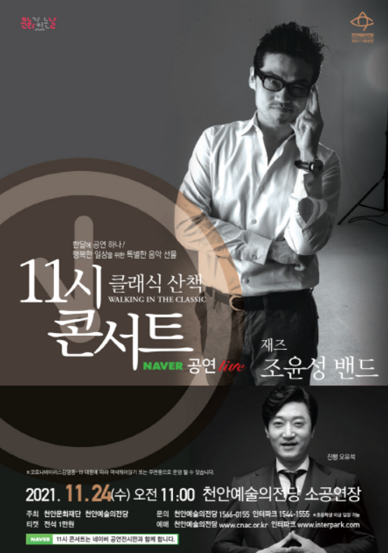 (포탈뉴스) 천안문화재단은 ‘해설이 있는 11시 콘서트- 재즈그룹 조윤성 밴드’ 콘서트가 오는 24일 오전 11시 천안예술의전당 소공연장에서 열린다고 밝혔다.