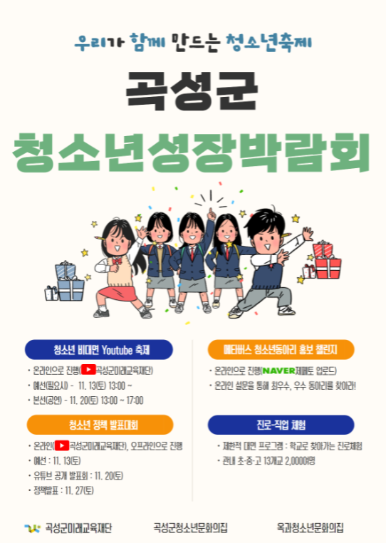 먼저 비대면 청소년축제는 오는 20일 오후 1시부터 5시까지 유튜브 채널 ‘곡성군미래교육재단’에서 진행될 예정이다. 1부에서는 청소년정책제안대회를 통해 청소년들의 목소리를 들어볼 수 있다. 총 10개의 팀이 곡성군의 더 나은 미래를 위해 필요한 정책을 청소년의 시선에서 제안하게 된다. 2부 청소년 재능 경연이 펼쳐진다. 12개의 팀이 평소 갈고 닦았던 춤과 노래 등 다양한 재능과 끼를 선보일 예정이다.