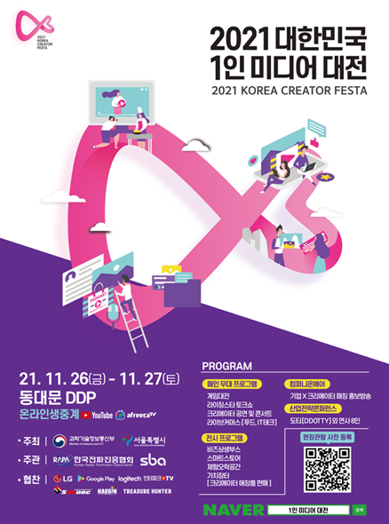 (포탈뉴스) 서울시와 과학기술정보통신부는 1인 미디어 창작자를 위한 대표적인 축제이자 우리나라를 대표하는 미디어 산업 행사인 ‘2021 대한민국 1인 미디어 대전(Korea Creator Festa)’을 11월 26일~27일 양일간 DDP에서 개최한다. 올해 3회째를 맞이하는 이 행사는 1인 미디어 산업의 성장가능성을 짚어보고, 앞으로의 발전방향을 모색하는 장으로 자리매김하고 있다.