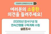 (포탈뉴스통신) 인천광역시교육청연수도서관은 9월 23일부터 3주간 ‘2026년 장서 구성 및 연속간행물 구독 계획 수립’을 위한 설문조사를 진행한다. 이번 조사는 2026년도 장서 구입과 자료 서비스 개선, 연속간행물 구독 목록 선정에 활용될 예정이며, 연수도서관을 이용하거나 관심 있는 시민이라면 누구나 참여할 수 있다. 종합·어린이·디지털자료실 현장 또는 연수도서관 누리집에서 참여 가능하며, 도서관을 직접 찾아 설문에 참여한 시민들에게는 소정의 기념품도 제공한다. 연수도서관 관계자는 “시민과 함께 도서관을 만들어가며 수요자 맞춤형 장서 구성으로‘미래를 열어가는 행복한 도서관’을 실천하겠다”며 적극적인 참여를 당부했다. 자세한 사항은 연수도서관 정보자료과로 문의하면 된다. [뉴스출처 : 인천교육청]