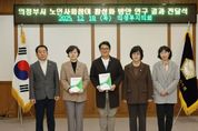 (포탈뉴스통신) 의정부시의회 ‘의정부시 노인사회참여 연구회’가 18일 연구용역 최종 결과를 집행부에 전달했다. 의정부시 노인사회참여 연구회는 조세일 대표의원과 김연균 의원, 정미영 의원으로 구성된 의원 연구단체로, 노인의 사회참여 현황과 효과를 분석하고 지역 맞춤형 정책 방안을 제시함으로써 노인의 삶의 질 향상과 세대 통합, 지역 공동체 회복을 위해 지난 5월부터 연구 활동을 돌입해 11월 연구 용역을 마쳤다. 연구회는 노인 관련 총괄 부서인 노인복지과에 노인의 사회참여 유형을 분류하고 방안을 제시하는 등에 대한 연구 결과를 토대로 작성된 연구용역 결과 보고서를 전달했다. 조세일 대표의원은 “이번 연구 결과를 바탕으로 담당부서와 협력하고 소통하여 노인사회참여 방안을 실체화하고 추진해 나갈 예정이다”라며, “고령사회 속에서 다양한 세대가 함께 공존할 수 있는 기반이 조성되길 바란다”라고 밝혔다. [뉴스출처 : 경기도 의정부시의회]