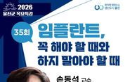 (포탈뉴스통신) 울진군은 오는 3월 19일 오후 5시 울진군청 대회의실에서 손동석 교수를 초청해‘임플란트, 꼭 해야 할 때와 하지 말아야 할 때’를 주제로 제35회이자 2026년 첫 목요특강을 개최한다. 손동석 교수는 대구가톨릭대학교병원 구강악안면외과 교수로 치과 임플란트 분야의 세계적 권위자로 알려져 있으며 아시아·미주·유럽·중동 등 30여 개국에서 초청 강연을 진행해 왔다. 또한 세계 100대 치과의사에 선정되는 등 국내외에서 활발한 학술과 강연 활동을 이어가고 있다. 이번 특강에서는 임플란트 치료가 필요한 경우와 그렇지 않은 경우를 비롯해 과잉·저가 치료의 위험성, 치료 후 발생할 수 있는 부작용, 병원 선택 시 고려해야 할 사항 등 임플란트와 관련해 반드시 알아야 할 핵심 정보를 군민의 눈높이에 맞춰 쉽게 설명할 예정이다. 또한 올해, 목요특강에 꾸준히 참여하여 지역 평생학습 활성화에 기여한 개인과 기관·단체를 대상으로 연말에 우수 참여자 포상도 실시할 계획이다. 연간 특강 참여 실적을 기준으로 선정된 개인과 기관·단체에는 군수 표창과 함께 포상금을 수여할 예정이다. 울진군 관계자는“임플란