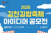 (포탈뉴스통신) 김천시는 국민과 함께 만들어가는 참여형 축제를 위해 ‘2026 김천김밥축제 아이디어 공모전’을 개최한다. 이번 공모전은 김천김밥축제를 더욱 참신하고 경쟁력 있는 축제로 발전시키기 위해 국민의 창의적인 아이디어를 발굴하고, 우수 콘텐츠를 실제 축제 프로그램에 반영하고자 마련됐다. 공모 기간은 3월 3일부터 4월 30일까지이며, 대한민국 국민 누구나 참여할 수 있다. 공모 주제는‘김밥’을 소재로 한 축제콘텐츠 아이디어로, ▲체험·참여 프로그램 ▲이색 테마존 및 공간연출 ▲어린이·가족·MZ세대·외국인 대상 맞춤형 콘텐츠 ▲지역 관광자원과 연계한 프로그램 ▲캐릭터 굿즈 및 브랜드 확장 등 다양한 분야에서 자유롭게 제안할 수 있다. 접수된 아이디어는 전문가 심사(80%)와 일반인 온라인 심사(20%)를 거쳐 총 10개 아이디어를 선정하며, 수상자에게는 상장과 함께 최우수상 100만 원 등 총 510만 원 규모의 시상금이 수여된다. 선정된 아이디어는 검토를 거쳐 실제 축제 현장에 반영될 예정이다. 김천시는 이번 공모전을 통해 국민이 직접 참여하고 아이디어를 제안하는 개방형 축제