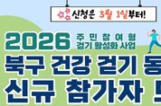 (포탈뉴스통신) 대구 북구보건소 강북보건지소는 3월 1일부터 31일까지 ‘2026년 주민 참여형 건강 걷기 동아리’ 신규 참여자를 선착순 모집한다고 24일 밝혔다. 생활터 중심의 건강 공동체를 발굴하고, 주민이 주도하는 걷기 활동을 통해 건강생활 실천 문화를 정착시키기 위한 취지다. 모집 대상은 20세 이상 북구 주민 및 북구 소재 직장 재직자 160여 명이다. 3~5인 1팀으로 동아리를 구성하여, QR코드를 통한 온라인 신청 또는 대표자 1인이 강북보건지소 방문 신청하면 된다. 선정된 참여자에게는 사전·사후 기초검사를 통한 건강위험요인 및 건강행태 변화 모니터링, 걷기지도자 양성 교육, 걷기 실천 달성자 및 우수활동자 인센티브 등 다양한 혜택을 지원할 예정이다. 자세한 사항은 강북보건지소 건강사업팀으로 문의하면 된다. [뉴스출처 : 대구 북구보건소]