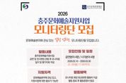 (포탈뉴스통신) (재)충주문화관광재단은 오는 30일까지 시민과 함께하는 소통 문화 확산을 위해 ‘2026 충주문화예술지원사업 시민 모니터링단’을 공개 모집한다고 밝혔다. 재단에 따르면, 시민 모니터링단은 2026 충주문화예술지원사업에 최종 선정된 예술단체(인)를 대상으로 공연 및 전시 현장을 직접 방문하여, 사업 운영 과정과 성과를 시민(관객)의 눈높이에서 모니터링을 통해 다양한 의견을 제시하는 역할을 맡는다. 이번 모니터링단 모집인원은 공연분야 4명, 시각분야 4명으로 문화예술분야에 관심 있고, 지원사업에 대한 홍보가 가능한 만 19세 이상 충주시민이라면 누구나 신청 가능하며 활동기간은 오는 4월부터 12월 충주문화예술지원사업 종료시 까지 활동하게 된다. 시민 모니터링단은 문화예술지원사업 공연 및 전시 현장 관람 후 모니티링 일지 및 평가지표 작성을 하며, 모니터링 회당 5만원의 활동비를 지급하고 활동 종료 후 활동증명서를 발급받는 혜택을 제공할 계획이다. 재단 관계자는 “2026년 지원사업 추진 현장을 방문하여 시민의 목소리에 귀를 귀울여 객관적인 모니터링을 통해, 사업 진행 상황 및 개선사항을